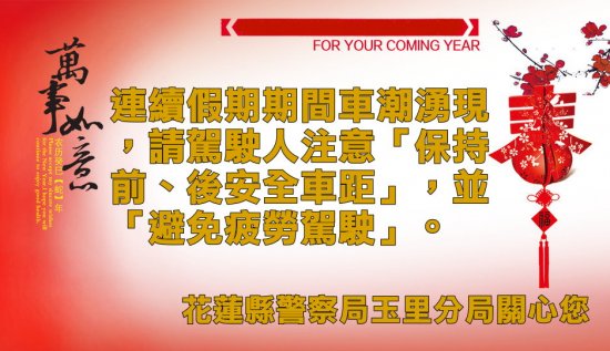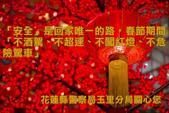 | (二) | 「安全」是回家唯一的路,春節期間「不酒駕、不超速、不闖紅燈、不危險駕車」,玉里警察分局關心您。 |